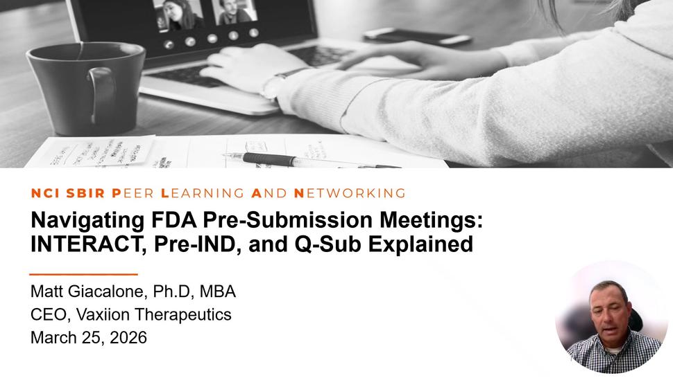 The NCI SBIR Peer Learning and Networking (PLAN) webinar series provides an interactive forum for oncology biotech startups to hear best practices from NCI SBIR standout companies who have achieved success in product development and technology commercialization.